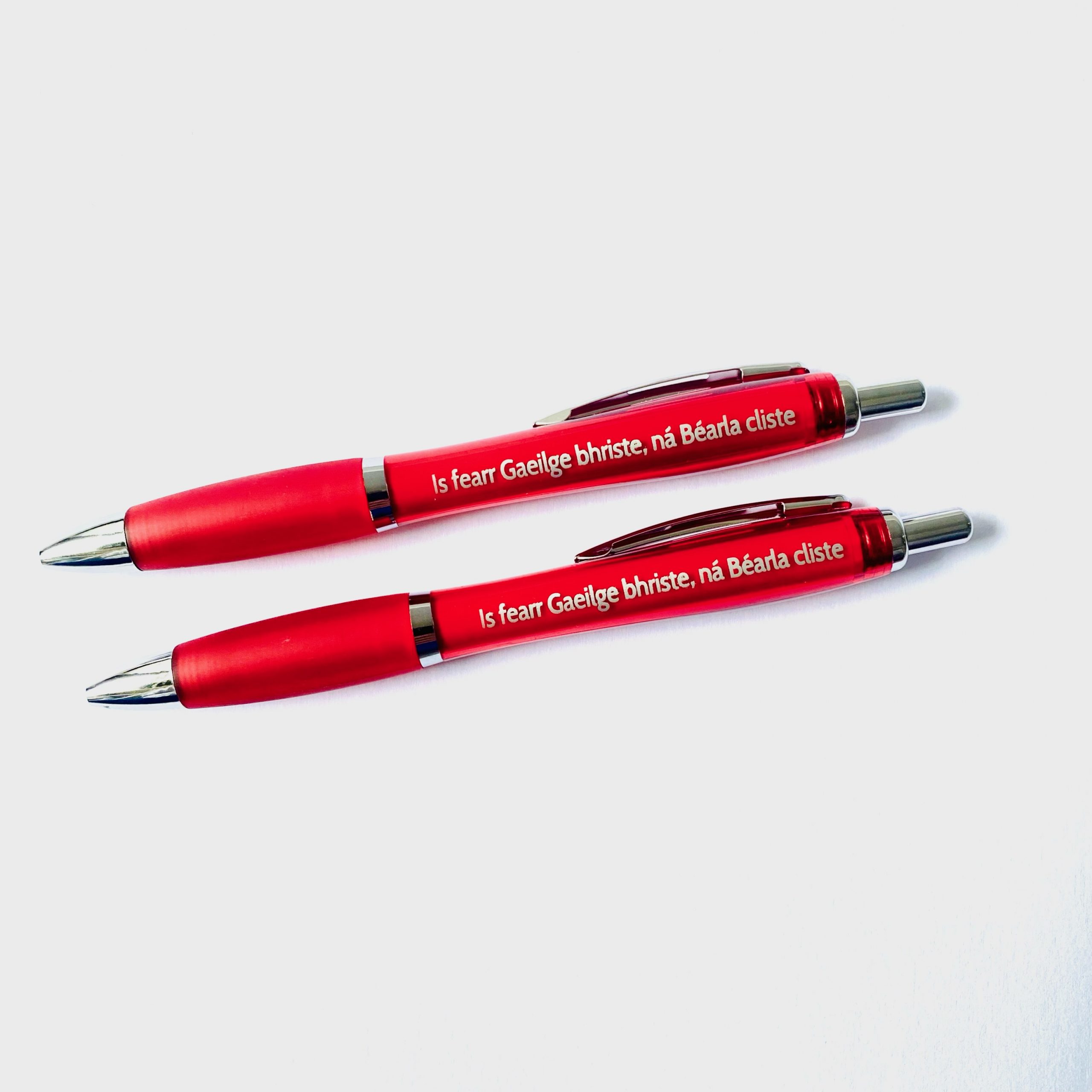 Set of 6 red pens with Irish saying translating to ‘Broken Irish is better than clever English’.